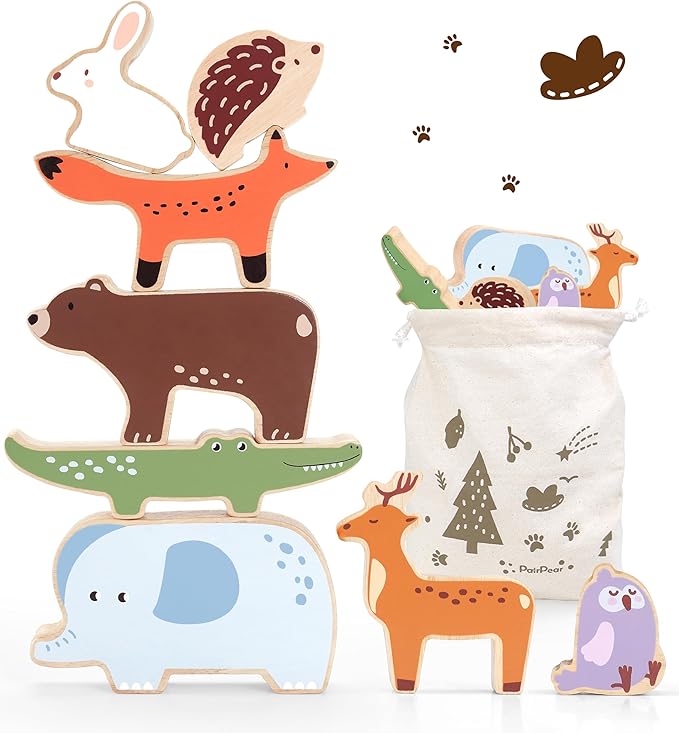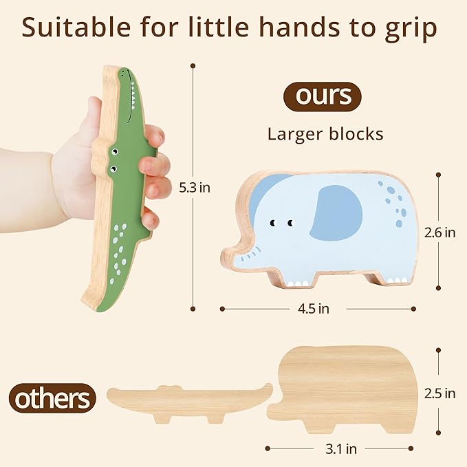 - Wooden Stacking Blocks: Step into the wild with PairPear oversized wooden animal stacker! These Large blocks are designed for little hands, making stacking a breeze and boosting little ones' confidence as they conquer the towering animal stack