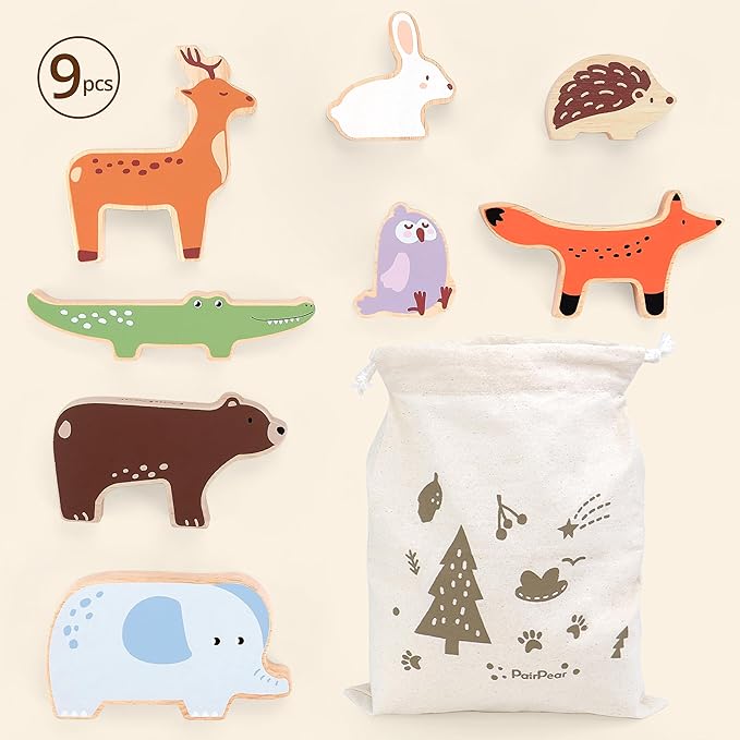 - 9 Pcs Set Contents: The set includes 9 adorable wooden animal blocks featuring a rabbit, hedgehog, owl, crocodile, elephant, fox, deer, bear, along with a convenient storage bag for easy organization and transport