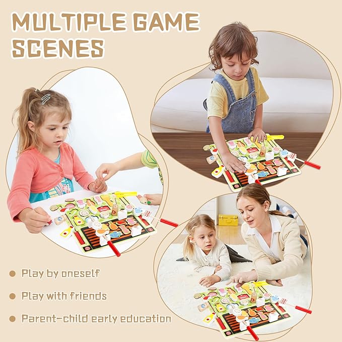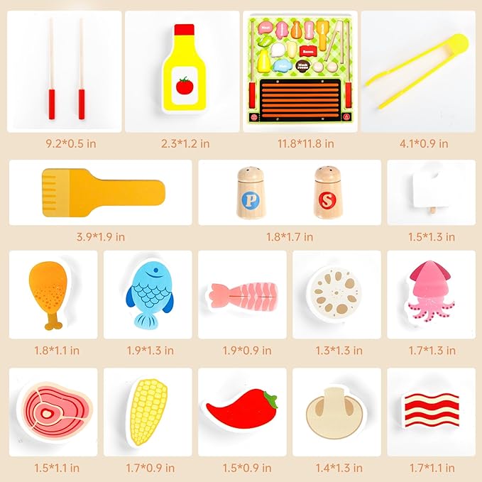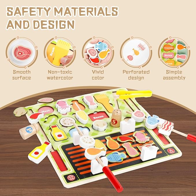 - đ„©ăSafe materială Our barbecue toys are made of high-quality wood, with a smooth surface, burr-free and durable; paired with colorful non-toxic watercolors, the colors are bright and vivid, no smell and will not fade, making it eye-catching for children.