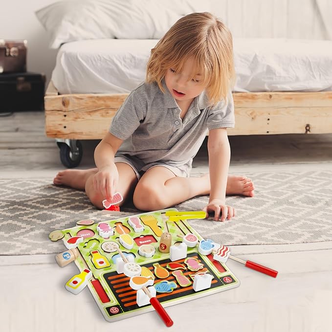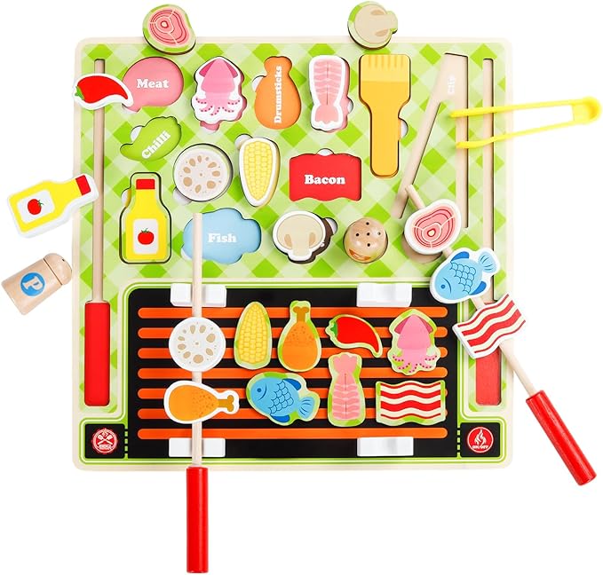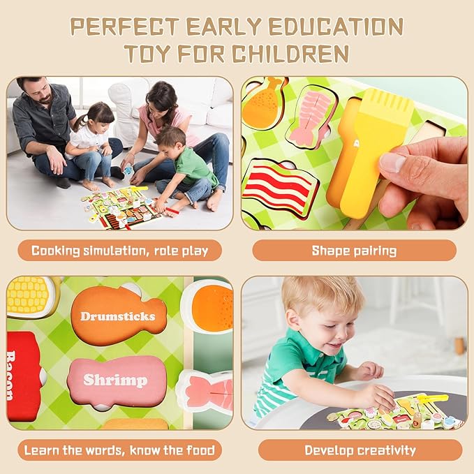 - đĄăWooden Barbecue Puzzle Toyă It includes 6 types of barbecue utensils and 10 types of food toys, and also comes with 10 identical food cards for children to learn and play with. Each toy puzzle is labeled with the corresponding toy name, and shape matching puzzle games can be played to help children better understand food/kitchen utensils, simulate barbecue, and successfully play the role of a little chef.