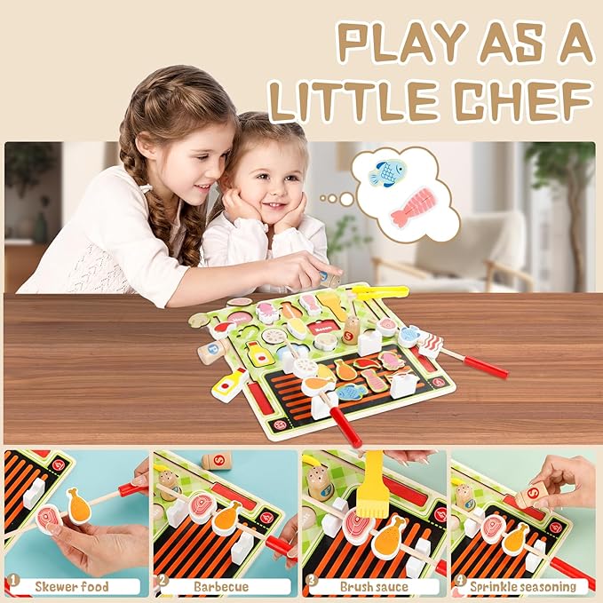 - đ„ăMini BBQ grill for kidsă The rich food props allow children to easily skewer food â barbecue â brush seasoning â finished product, stimulating childrenâs imagination and hand-eye coordination. Parents and friends can also join in to increase parent-child interaction and enjoy the fun of being a chef.