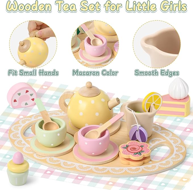 - KIDS TEA PARTY TIME: Every child has a fairy tale tea party dream, now let the dream come true! Our wooden tea party toy set is the ideal key to unlock your child's imagination and social skills. Children can take on different roles, such as elegant tea party hostess, guest of honor, etc., to stimulate their acting talents, pour tea or lemonade into a cup, and start tea time
