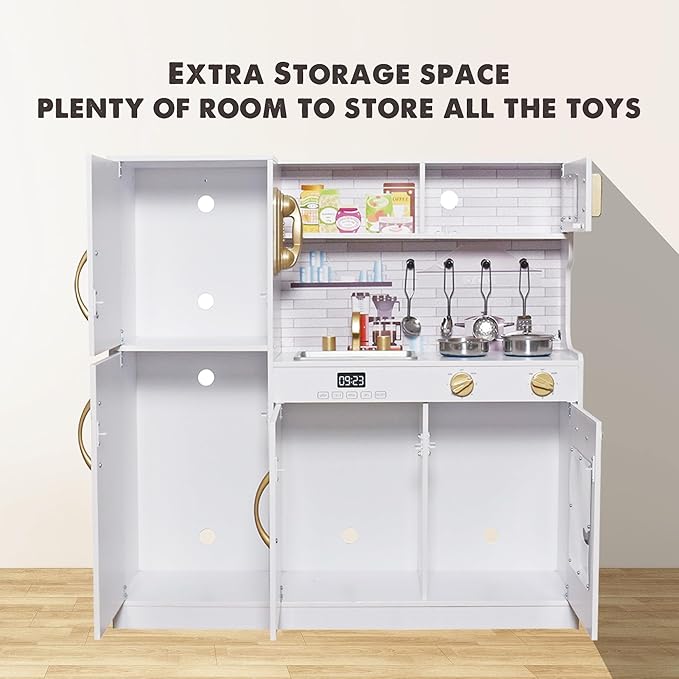 - š Simulated Design - Play Kitchen with Lights. Oven, cabinet, freezer, refrigerator and microwave doors open and close. Equipped with a variety of realistic cooking utensils,make pretend play more lively and interesting. Create an immersive play experience for children and kids
