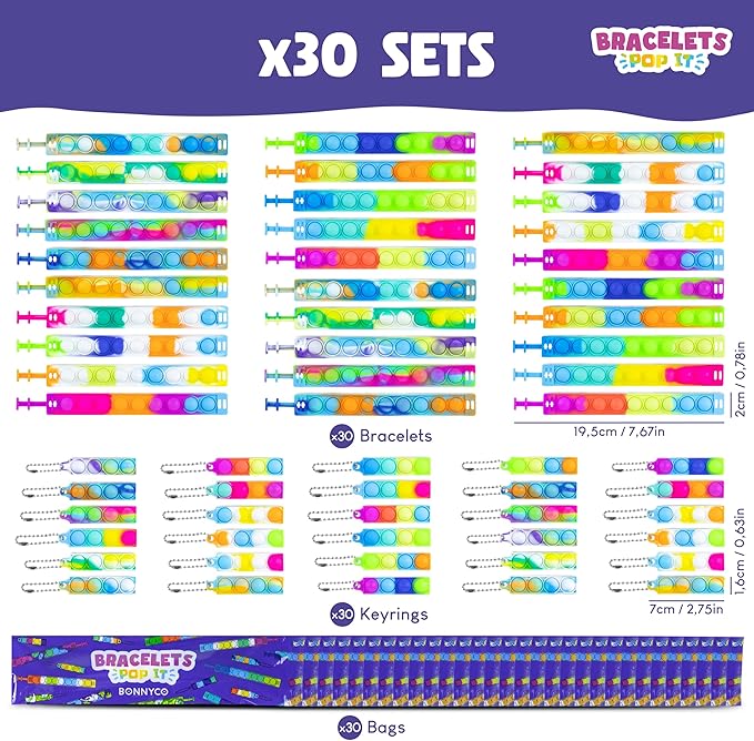 - 🫧 KIDS PARTY FAVORS 30 PACK OF BRACELETS AND KEYCHAINS 🫧 In each bag, you'll find a bracelet and a matching keychain with bubbles to squeeze, ideal as goodie bags stuffers for kids. In total, there are 30 models of each with 15 different colors. The pop it bracelets have 9 squeeze bubbles, and the pop it keychain have 4. This pop it fidget toys bulk are a super relaxing accessory!