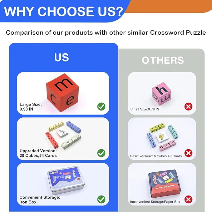- 【Upgrade Version】Matching letter game for kids comes with 1 iron storage box, 20pcs upgrade large letter cubes, 54pcs flash cards with cute illustrations.
