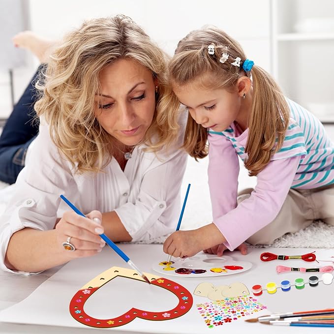 - Valentine's Day Craft for Kids:The unfinished wooden dream catcher diy kit includes 6 x Large wooden heart ring,6 x Wooden Best MOM letters,18 x Small wooden heart ,6 x Cotton thread,100x Feathers,2x Painting Brushes,1x Paint(6 colors),1x rhinestone sticker. Enough quantities can meet kids DIY decoration needs,kids can make a beautiful dream catcher Craft Kit in the Valentine's Day and Mother's Day.