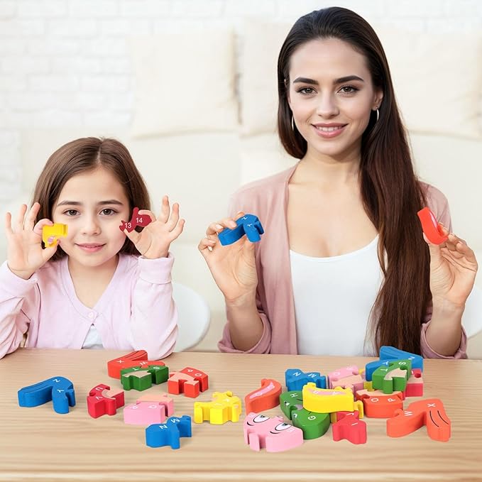- Explore and Learn - Our toddler wooden puzzle offers double-sided fun with English letters A to Z on one side and numbers 1 to 26 on the other. Each wooden block is carefully painted, enhancing its appeal and educational value. These special blocks are designed to enhance your child's cognitive skills, hand-eye coordination, patience, and memory, all while making learning letters and numbers an enjoyable experience.