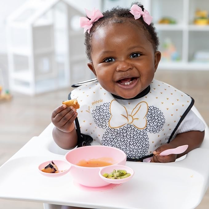 Bumkins Disney Baby Bowl, Silicone Feeding Set with Suction for Baby and Toddler, Includes Spoon and Lid, Essentials for Baby Led Weaning,for Babies 4 Months, Minnie Mouse Light Pink