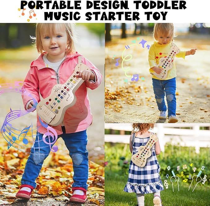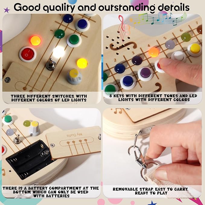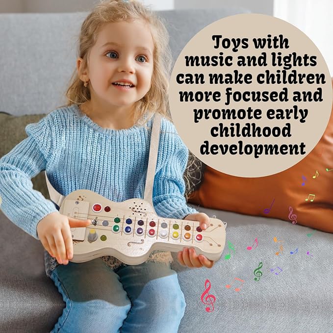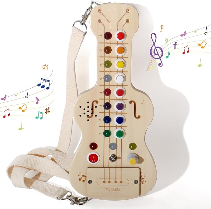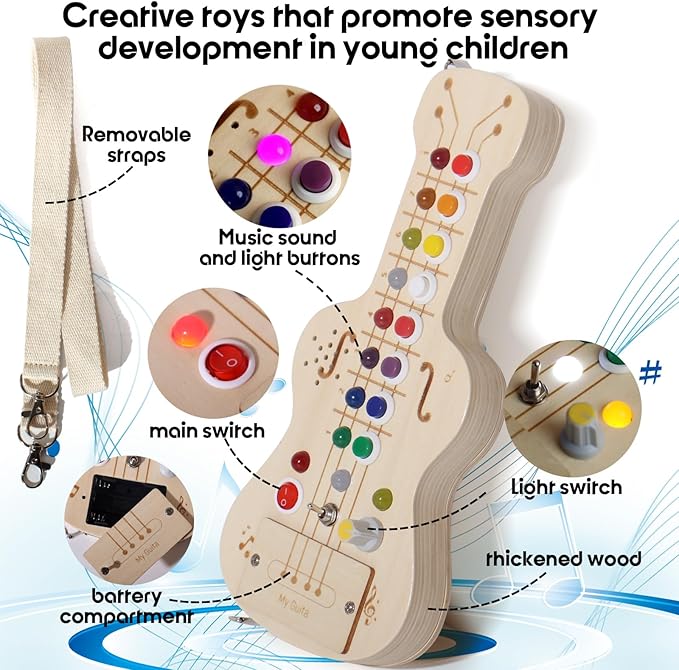 - Our Difference:The Dinhon Acoustic and Optical Guitar Toy Cleverly Combines the Shape of a Children's LED Acoustic and Optical Busy Board with That of a Guitar, Making This Toy Not Only Unique in Appearance but Also More Appealing to Children. Additionally, We Have Fitted It with a Sling so That Kids Can Enjoy Wearing It. Whether at Home or While Traveling, This Toy Is Convenient to Bring Along.