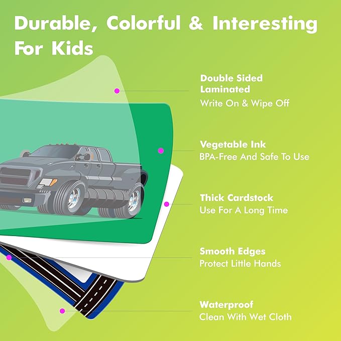 - Easy to Use: Double-sided design makes you have different ways to play. One side printed with vibrant patterns for matching pairs, another side is blank, you can draw pictures on it and make a new game with your imagination. Also, the cards can be used for categorizing trucks, practicing vocabulary, or even creating imaginative stories using the vehicles depicted on the cards.