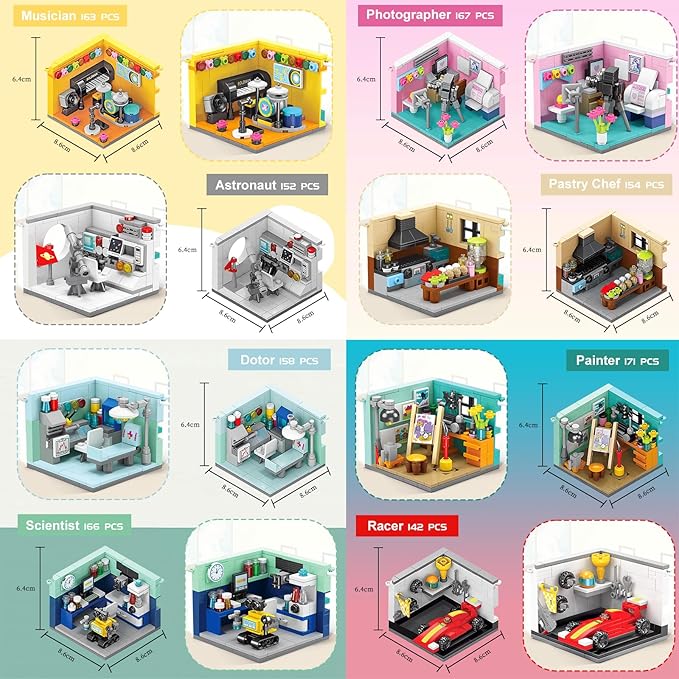- Build Home Building Block Toy: 8 Sets total 1273 pcs regular size bricks (compatible). There are 8 room styles corresponding to different career. 8 rooms can be arranged in rows, squares or stacked. For age 8+ girls or boys