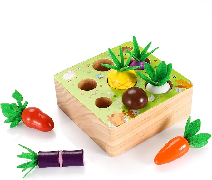 - š„Educational Sorting Montessori Toys for Toddlers: This sorting game wooden toys can help kids to recognize different size of vegetables and fruits, put them into the corresponding slots according to the sizes to complete harvest, which will enhance their concentration, reinforcing pattern, problem-solving abilities and manual dexterity.