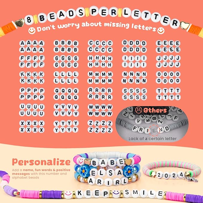 - Funny Crafts Kit for Girls: The packaging includes: 3600pcs 20 colors clay beads, 208pcs letter beads (26 letters from a to z, each with 8 beads), 500pcs decorative beads, including shells, pearls, silver pendants, number beads, smiling hearts, flowers, fruit beads, etc. There are also 2 organza gift bag, 3 bundles of elastic ropes, scissors, tweezers, all tools are complete and very beginner friendly