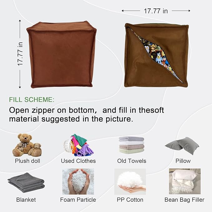 Louis Donné Unstuffed Ottoman Pouf Cover, Soft Handmade Pouf Ottoman Cover Foot Stool, 17.72" Square Small Bean Bag, Ottoman Foot Rest with Storage for Living Rooms Bedrooms, Brown (ONLY Cover)