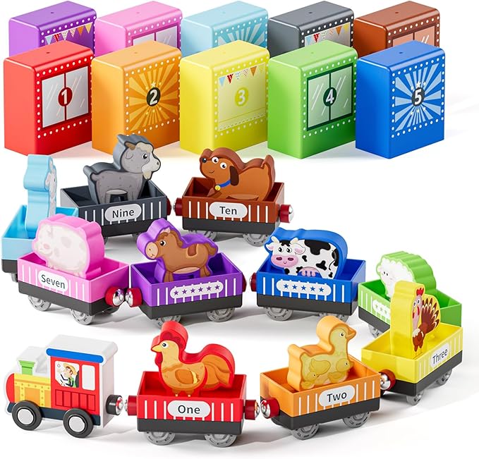 • Montessori Preschool Learning Activities: Our wooden train includes 10 magnetic train set.Kids can know and learn about 10 different farm animals and identify their characteristics from our toys.The train carriages are printed with numbers from 1 to 10,and the trains has dots corresponding to the numbers. Babies can have fun number learning and color matching sorting games based on these,exercise their counting,color recognition,classification and matching skills. Best toddler educational learning toys, let our cute animals accompany your kids through childhood