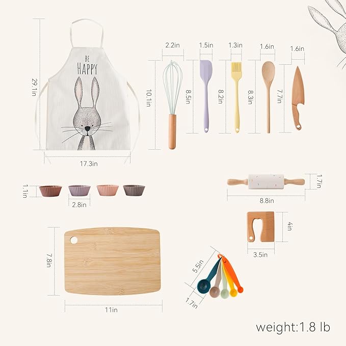 - ๐๐ ๐๐ข๐๐๐๐ฌ ๐๐ข๐๐ฌ ๐๐จ๐จ๐ค๐ข๐ง๐ ๐๐๐ญ: This kid-sized real cooking and baking set is perfect for the little bakers in your family. The Kids Cooking Utensils are easier and safer for children to use and include 2 types of kids knives, child-sized apron, cutting board, whisk, wooden spoon, rolling pin, pastry brush, spatula, 4 silicone cupcake cases and 5 measuring spoons.