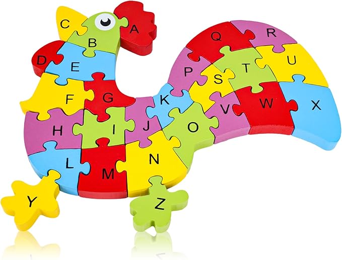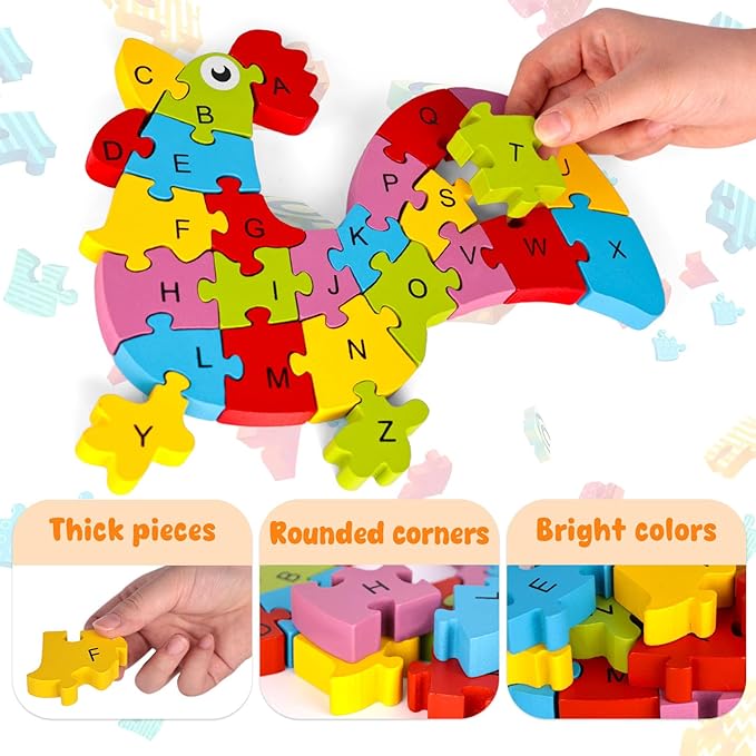 LovesTown Wooden Alphabet Puzzle for Kids, Educational Rooster Shape Letter Learning Blocks, 26 Pieces