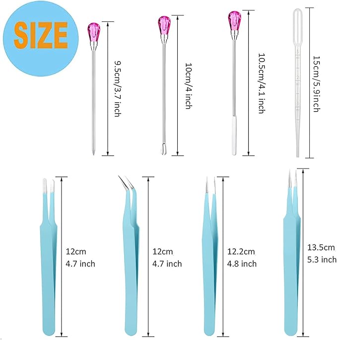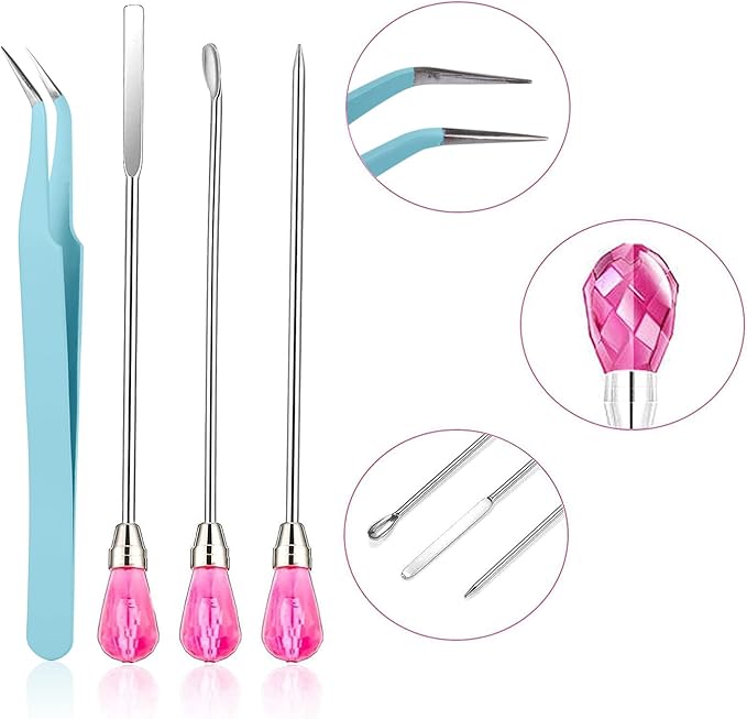 - 【11 Pcs Cute Resin Tools】: Our metal resin stir sticks includes 2 pcs stir sticks, 2 pcs resin spoons, 2 pcs poke needles, 4 pcs epoxy resin tweezers and 1 pc transfer pipette. These uv resin tools are totally enough for your daily needs and use. They will be your practical assistants in DIY resin work. NOTE:If the pink gems are loose. A simple twist and they are fine.