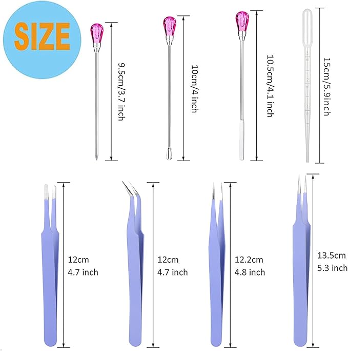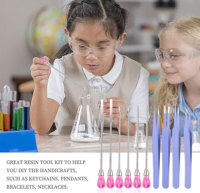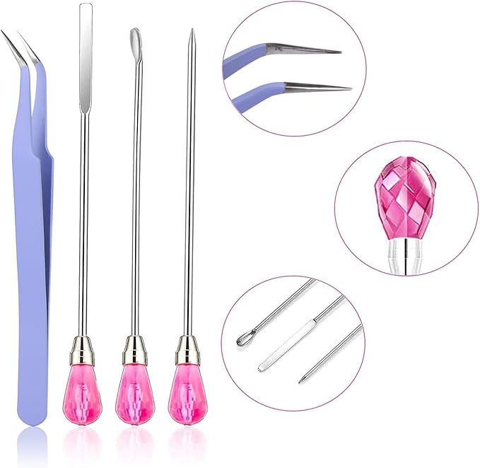 - 【11 Pcs Cute Resin Tools】: Our metal resin stir sticks includes 2 pcs stir sticks, 2 pcs resin spoons, 2 pcs poke needles, 4 pcs epoxy resin tweezers and 1 pc transfer pipette. These uv resin tools are totally enough for your daily needs and use. They will be your practical assistants in DIY resin work. NOTE:If the pink gems are loose. A simple twist and they are fine.