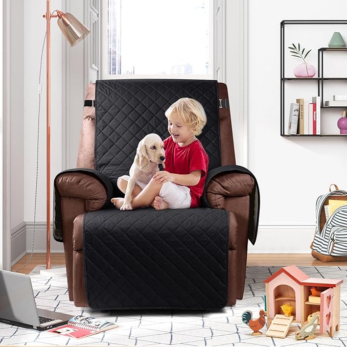 KinCam 100% Waterproof Recliner Chair Cover, Reclining Couch Covers for Pets, Dogs, Recliner Couch Slipcover Furniture Protector with Elastic Straps for Kids(30", Black)