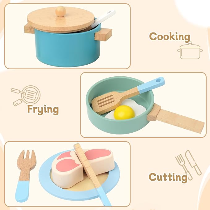 • 【Safe and High quality】Made of high quality wood and non-toxic water-based paint, realistic design and size suitable for small hands, toddlers will safely pretend kitchen play. Compared to plastic sets, wooden pots and pans for children would last longer and likely to be the toys that accompany children throughout their childhood.