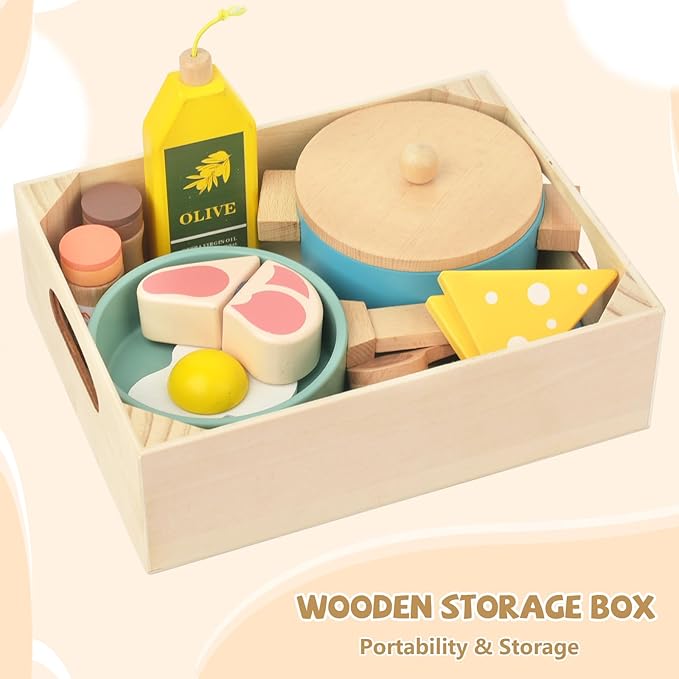 • 【20 PCS Play Kitchen Accessories】This wooden kitchen playset contains 20 pieces toys including stock pot, frying pan, pot lid, spoon, spatula, plates, knives, forks, spices, olive oil, meat, cheese slices and fried egg. This playset also comes with a wooden storage box with handles for easy portability and to store the toys after playtime.