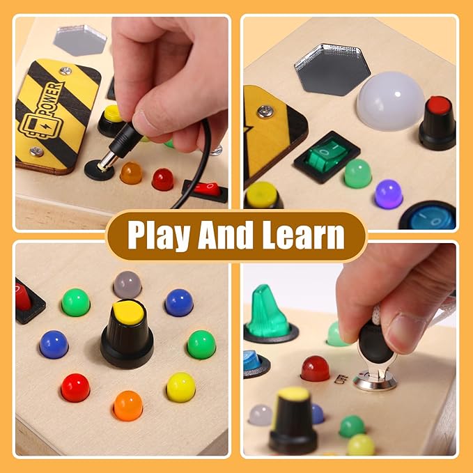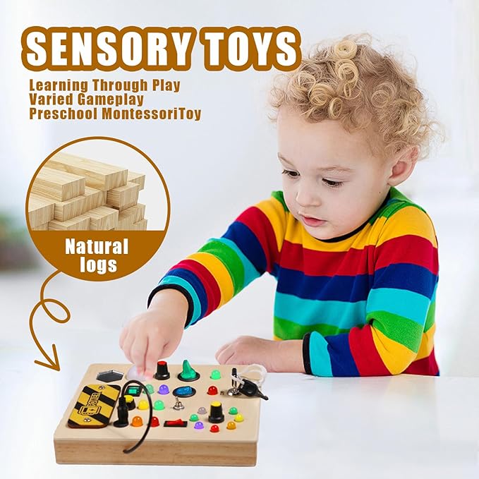 - High Quality Sensory Toys - Our toddler fidget toys are made of natural wood with smooth edges. All the various buttons, switches, and shifters are securely installed. The busy board with led lights is high quality and very sturdy, ensuring safety for your child. The light is soft and won't hurt children's eyes