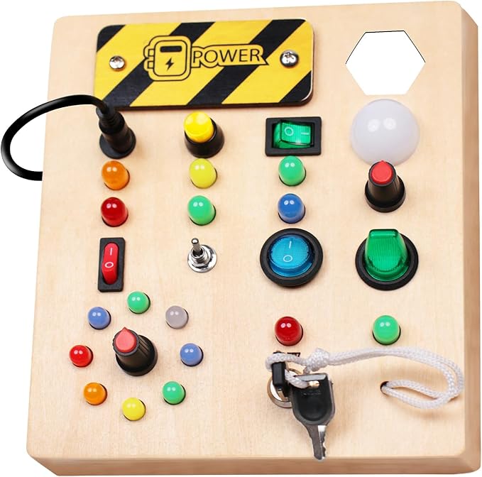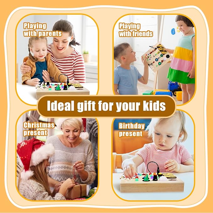 - Toddler Montessori Busy Board - This toy is designed for kids who love switches and LED lights. This wooden toys is set with 10 different switches, each corresponding to a different color or style of LED light.At the same time, this busy board also has a master switch to turn off all the lights with one click to avoid tedious operation.The board also comes with a mirror to keep your child occupied throughout the journey
