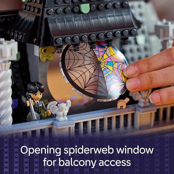 - NEVERMORE ACADEMY SET – The school playset includes a buildable dorm room with a spiderweb window that opens, a base with buttons that open secret drawers and a balcony with 4 gargoyles