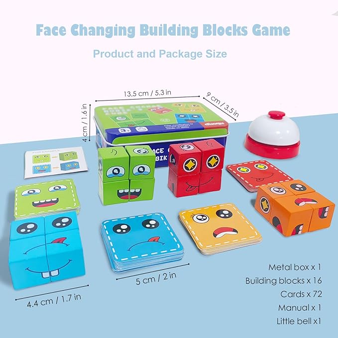 - 【Designed for Kids】The face change cube game is an educational toy for 1 to 4 players that is loved by children. The toy includes 72 cards, 16 colorful blocks, a manual and a beautiful storage iron box. By selecting the cards and building the blocks in the pattern shown, players complete the puzzle and enjoy the joy of victory.