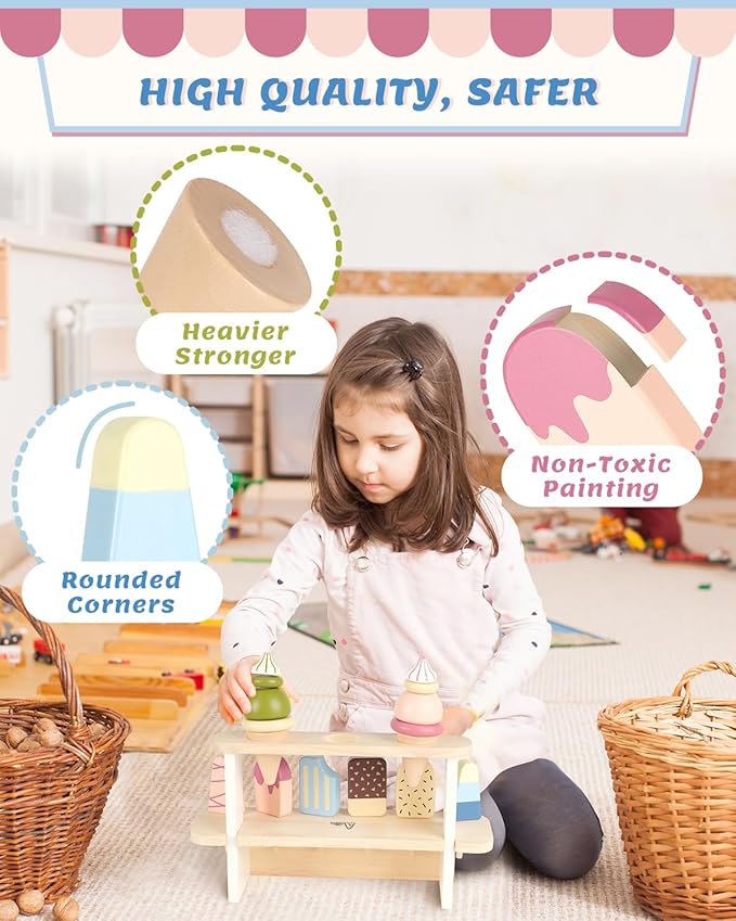 - 【 HIGH QUALITY AND SAFETY 】We use high-quality wood to make this ice cream toys for toddlers 3-5 and use non-toxic, odorless paint for painting to ensure the safety of your children when playing.Security testing approved