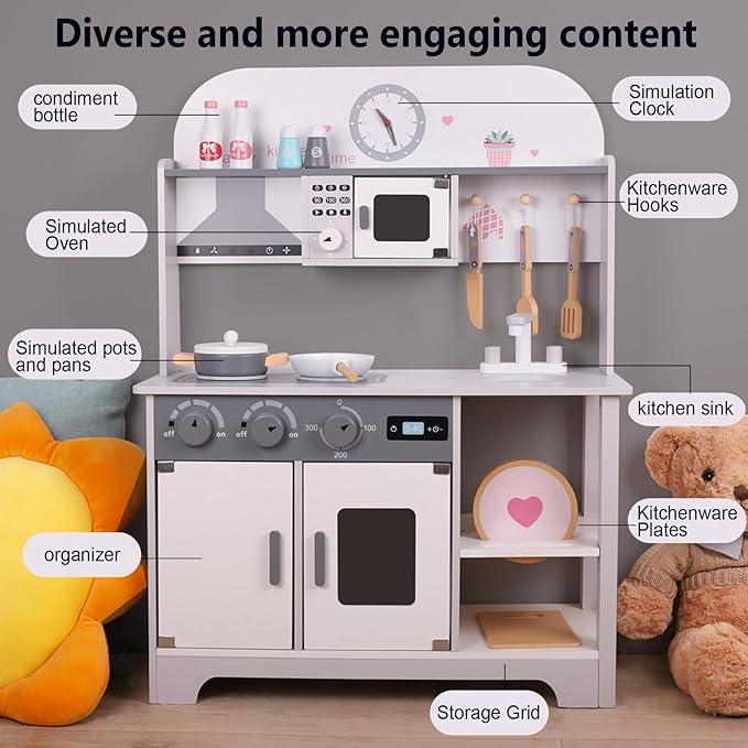 • MORE THAN JUST A KITCHEN: Our innovative Kids Kitchen Play Set redefines playtime with groundbreaking storage space. It's not just a play area, it's a haven for kids to learn organizational skills. Each kitchen play set for kids ages 4-8 finds a unique place to develop self-storage habits and maximize space efficiency.