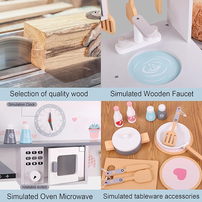 Wooden Kitchen Sets for Kids, Play Toddler Kitchen Playset, Chef Pretend Kitchen with Plenty of Play Features, Toy Kitchen with Toy Food & Cookware Accessories, Early Education Toy Gift for Boys Girls