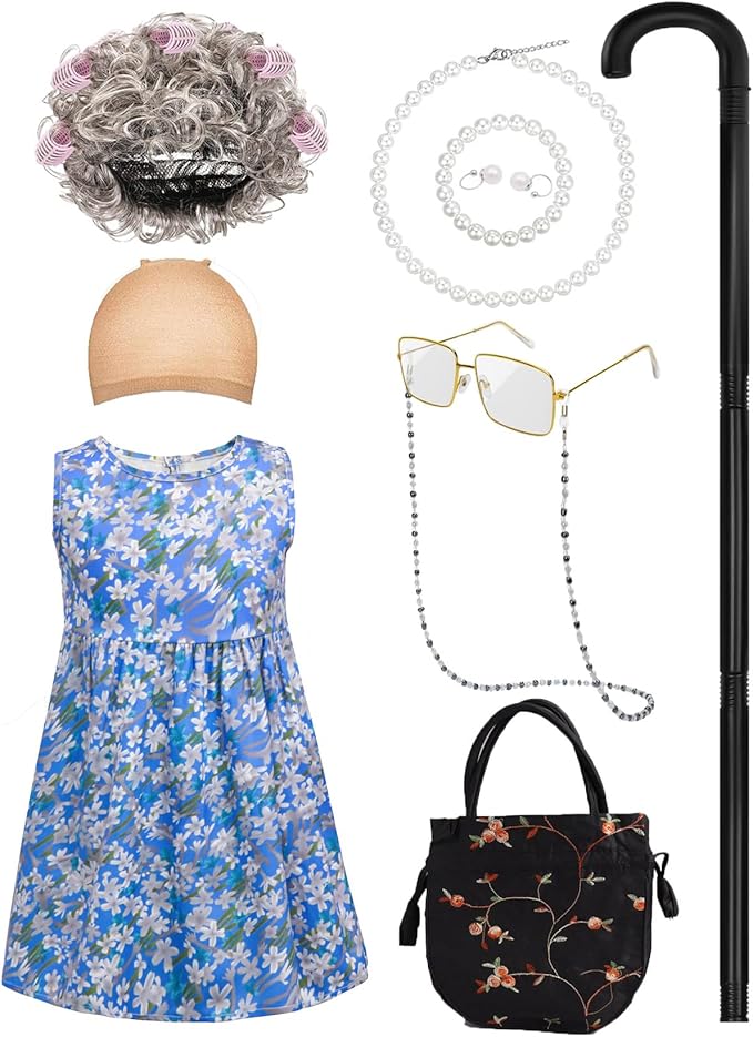 - YouthBro Full Old Lady Costume Pack with 1 x old lady costume dress clothes; 6 x pink HairCurlers; 1 x old lady wig; 1 x black cane; 1 x granny glasses; 1 x grandma costume eyeglass chains strap; 1 x faux pearl beads necklaces; 1 x fake pearl beads earrings; 1x faux pearl beads bracelet; 1 x wig cap; 1x black handbag