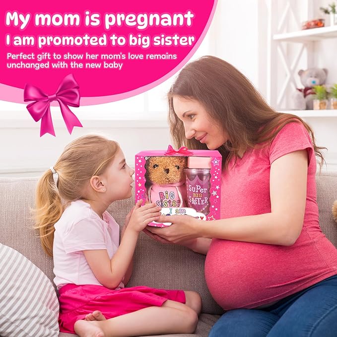 - ❤️ THE PERFECT GIFT TO CELEBRATE HER BECOMING A BIG SISTER: When little girls find out they’re promoted to big sister, they may feel anxious, fearing their parents' love will be divided. This big sister gift reassures her that her parents' love and attention won’t diminish with the new baby. Let her know she is still cherished with this thoughtful gift for big sister. Whether it's a big sister announcement or a simple I’m going to be a big sister moment, this gift set celebrates her special role as the new big sister.