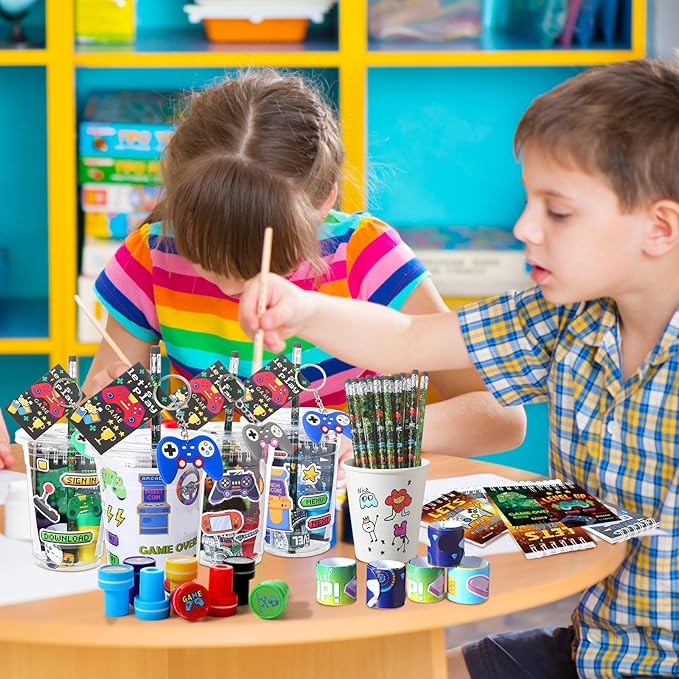 - Comprehensive Video Game Party Favors Package: leave no stone unturned for your upcoming party with our inclusive video game party favors; This package caters to every guest, with 24 drink cups, 24 notebooks, 24 pencils, 24 pencil sharpeners, 24 keychains, 24 slap bracelets, 24 rings, 24 stamps, 24 DIY stickers, 24 tattoo stickers, 24 thank you tags, and a pack of twist ties; Ideal for making a memorable gaming themed birthday party for your kid, this package is your thoughtful choice