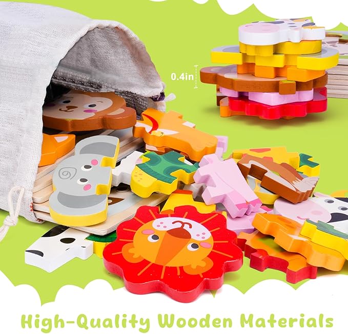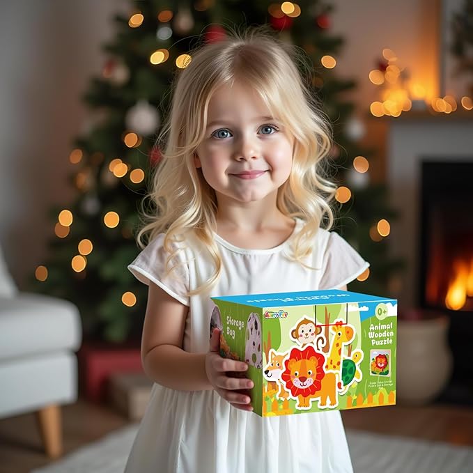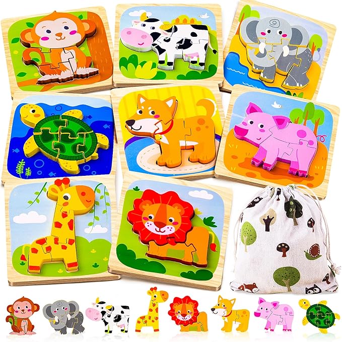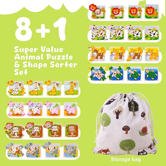 - SUPER VALUE "8+1"TODDLER PUZZLES SET: Our animal toddler puzzle set includes a convenient storage bag and features 8 delightful and brightly colored wooden puzzles, each shaped like a different adorable animal. This educational toy for toddlers aged 1-3 and 2-4 is not only designed for entertainment but also enhances your child's understanding of the natural world, while keeping all pieces neatly organized.