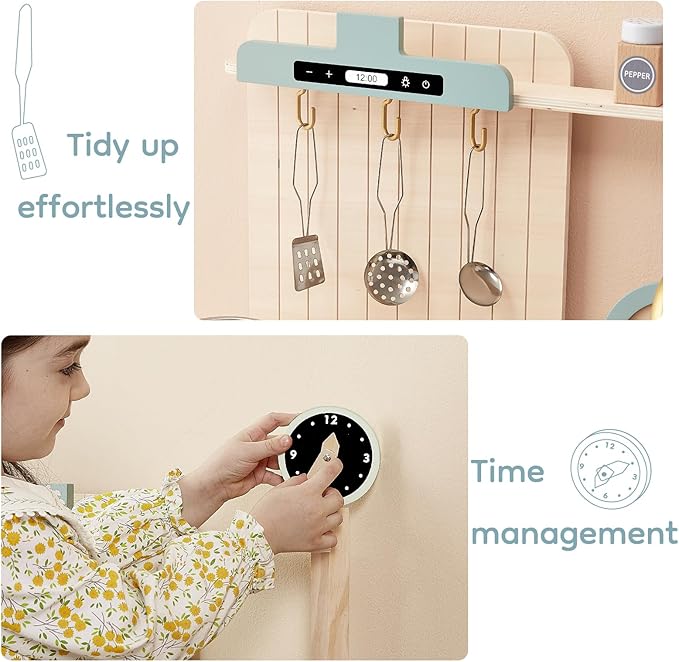 - Educational Toys: With the included kitchen accessories, kids can practice cooking skills and learn about different utensils. Pretend clean sink sparks imagination and teaches kitchen hygiene.The unique-shaped clock adds a time management element. It's a perfect combo for imagination and learning, making it a great gift for any occasion. Your child will love this toy for years to come