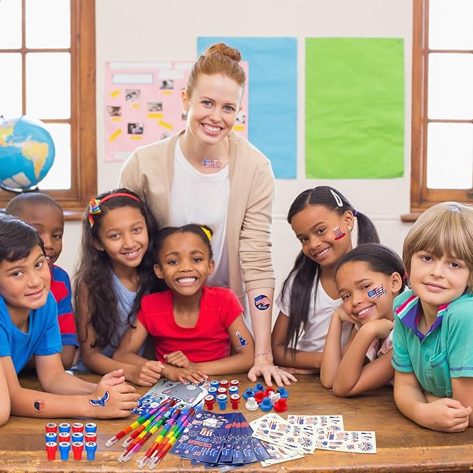 - Safe Materials: our 4th of July party favors set are quality, made of quality materials, and safe with smooth surfaces; Tattoos can be easily removed with makeup remover,and our stacking buildable 12 colors crayons are made of paraffin and plastic; squishy pinch and stamps are made of plastic, other stickers are made of paper, nontoxic, safe material, safe for children to use