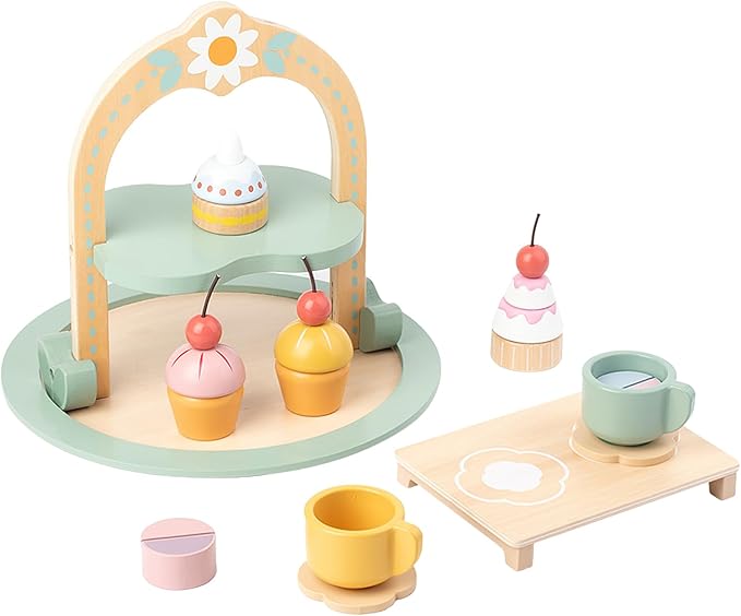 Wooden Dessert Cake Tea Party Set for Little Girls Toys, Pretend Play Kids Tea Set for Toddlers Wood Toys, Wooden Play Food Kitchen Accessories Sets for Kids (Garden Tea)