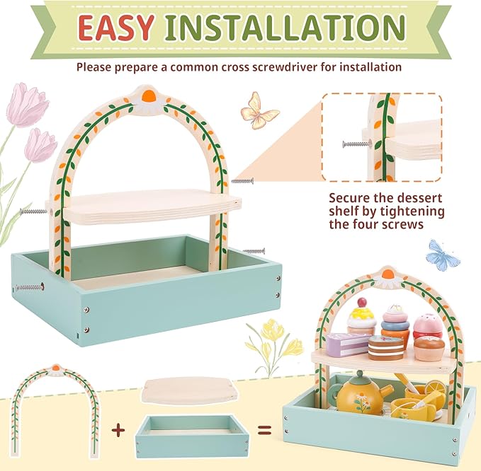 - 【Safe Kitchen Set for Toddlers 3-5】 Our kids tea set is made of eco-friendly wood materials to ensure stability and durability of the product, colored with eco-friendly water-based dyes, and the edges of all the items are polished and smooth so that they won't cause harm to children. Additionally, the bottom of our cake stand is designed with a wooden fence, and all accessories can be placed on the bottom layer for easy access and storage.