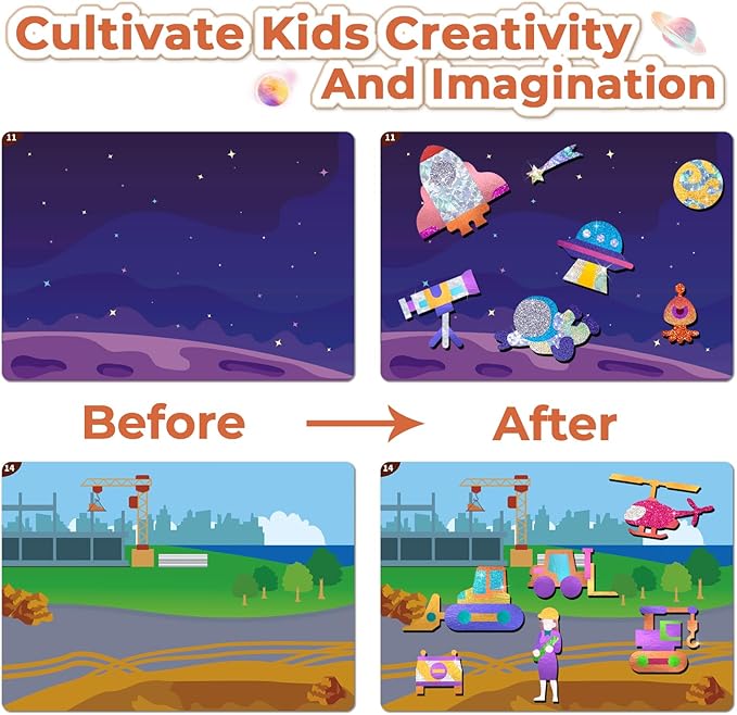 - 【Foil Art & Craft Activity】Let your child's imagination run wild with the amazing, mess free foil arts and crafts activity. Beautiful images of spacecraft, cars, airplanes, spacecraft, rockets, satellites, planets, and more, inspiring hours of creative fun for kids.