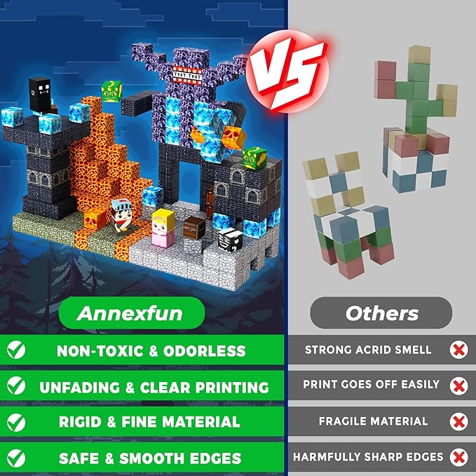 - 【Dark Mechanical Guardian Castle Magnetic Cube Kit】Including 100 magnetic cubes in 16 colors. Idea booklet with the storyline and beautiful patterns, keep them busy in clever ways. AnnexFun magnetic activity cubes are made of high-quality ABS material and crafted with the round edges and the right size. Our magnetic cubes kit with super strong internal magnetic, which is easier for toddlers ages 3+ to stick the cubes together and make builds sturdy. Perfect STEM toys help kids gain a deeper understanding of the structure and learn about magnetic properties!