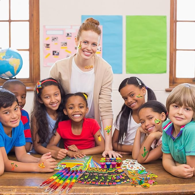 - Mexican Party Favors Set: our Mexican Party Favors set includes 12 coloring books(12 pages per book), 12 rainbow stacking crayons(8 colors),12 tattoos, 12 stampers, 12 DIY Art Craft stickers, 6 rings and 6 keychains, sufficient quantity, and various styles enrich your Mexican Party