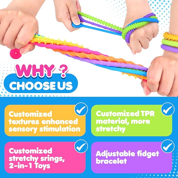 - QUIET CALMING TOOL: These kids rubber stretchy fidgets are helpful for boys and girls who struggle with some pressure and sensory issues. Especially meet the special needs of children with autism as they pull and stretch