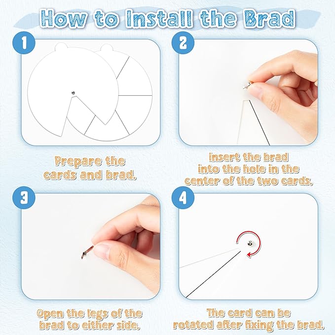 - Easy to Use: The kit comes with brads that can be used directly for assembly. Firstly, prepare the cards and brad. Secondly, insert the brad into the hole in the center of the two cards. Thirdly, open the legs of the brad to either side. Finally, the card can be rotated after fixing the brad.