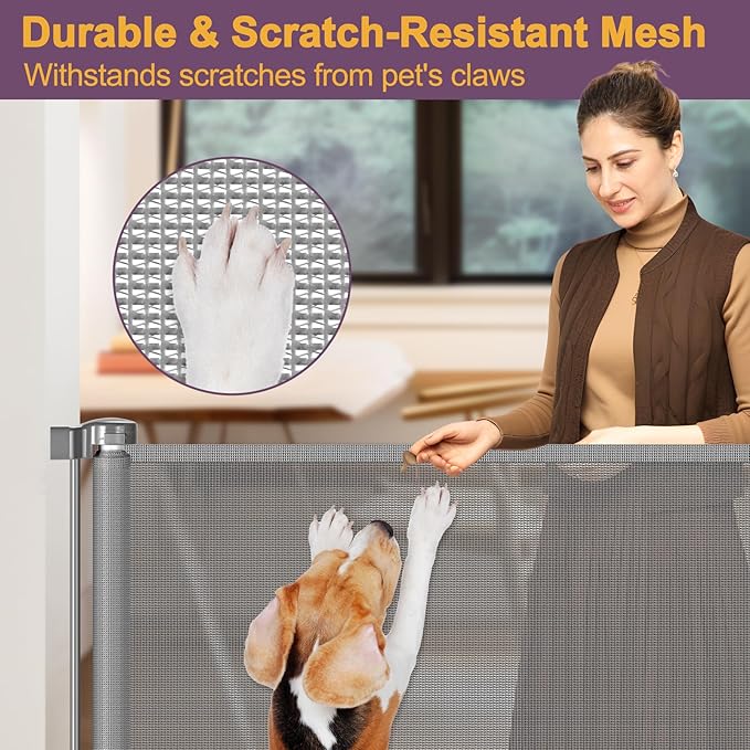 - Durable & Scratch-Resistant Mesh: Our extra tall retractable baby gate is made of upgraded mesh lining that is durable, soft and scratch resistant. It can withstand the scratching of your dog's paws.