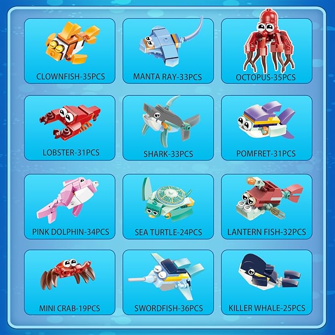 - Ocean Animal Building Sets - This ocean animal blocks allow children to create their own dream ocean animal world game. This ocean animal blocks include: lobster;shark;pomfret;octopus;pink dolphin;Marine turtle;lantern fish;clownfish;mini crab;swordfish;killer whale;manta ray.These twelve small Animals can be put together into a large sharks.Each Marine animal is individually equipped with a sheet of operating instructions.
