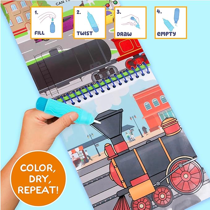 - SET INCLUDES: 1 Transportation-Themed Aqua Art Pad (4 Pages, 6 in. x 7.5 in.), 1 Water Pen