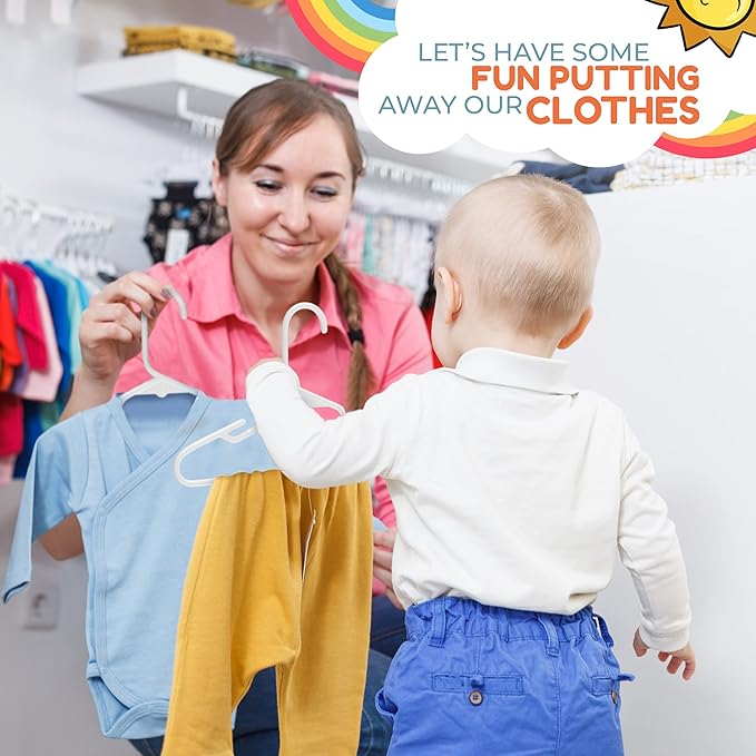- KID FRIENDLY DESIGN - No metals or sharp object, these hangers are designed with the child in mind. They are the right size for kids' clothes, and the smooth finish ensures that clothes won't be torn, snagged or pulled. Available in different colors to match any nursery or closet decor.